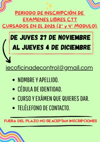 INSCRIPCIONES A EXÁMENES LIBRES CTT Publicación de la entrada:26/11/2025 También podría gustarte CURSO Reanimación Cardio-Pulmonar 18/10/2023 DEFENSA DE PROYECTO-Tecnicatura de Construcción Énfasis en Arquitectura Obra Seca 15/07/2025 CAMBIO FECHA DE EXÁMENES DEL DÍA 26/9 25/09/2025